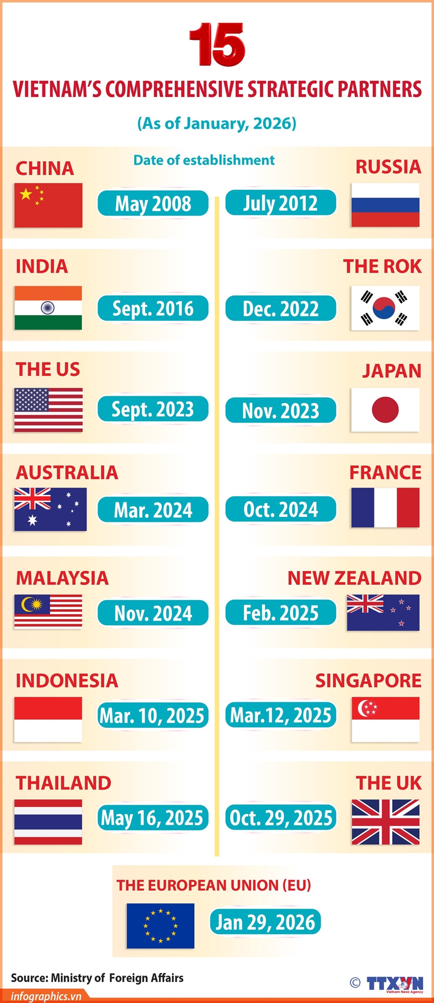 On January 29, 2026, Vietnamese State President Luong Cuong and European Council President António Costa announced the upgrade of Vietnam–EU ties to a Comprehensive Strategic Partnership, bringing Vietnam’s total number of such partners to 15.